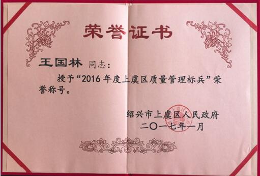 2017年1月,公司董事長王國林被授予“2016年度上虞區(qū)質(zhì)量管理標(biāo)兵”榮譽(yù)稱號,此榮譽(yù)為公司2011年榮獲上虞區(qū)區(qū)長質(zhì)量獎后又一質(zhì)量管理大獎,全區(qū)僅授予2名。